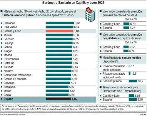 (Ampliación) Los castellanos y leoneses otorgan un 6,4 a su sanidad pública en 2025, la tercera nota más alta del país